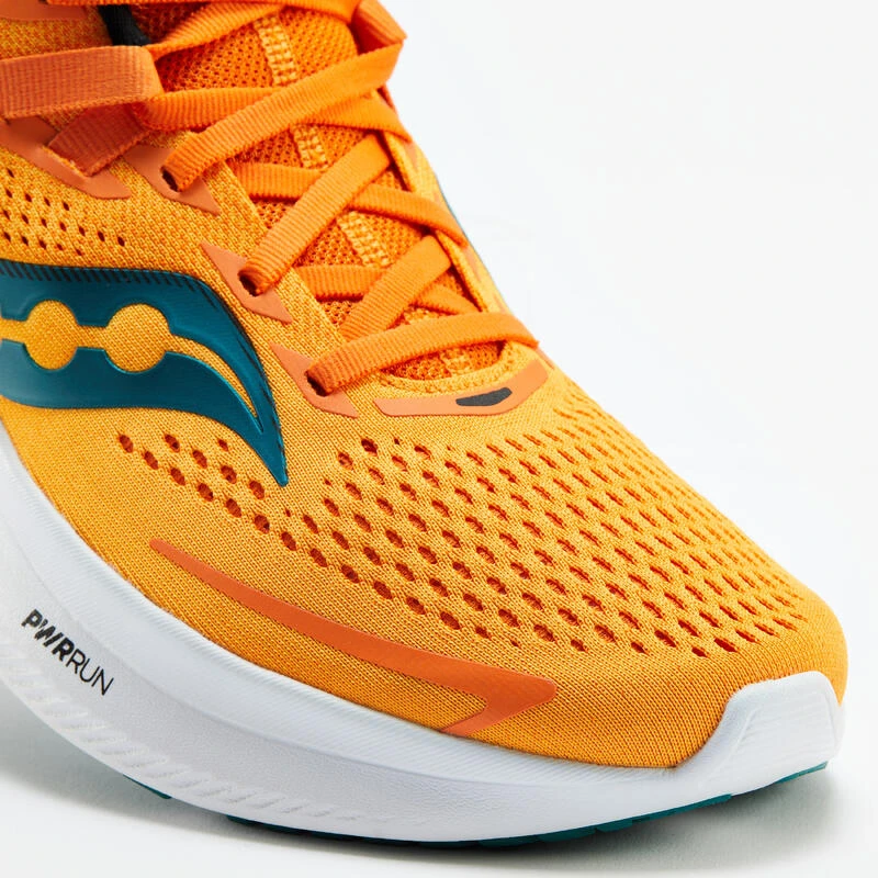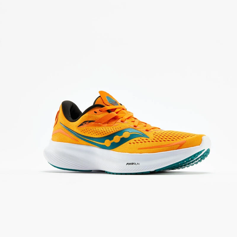 Chaussure de running homme Saucony Ride 15 conçue pour les coureurs cherchant une chaussure légère et dynamique pouvant aller jusqu’au marathon.Chaussure de running homme Saucony Ride 15 conçue pour vous accompagner sur de nombreux kilomètres grâce à la nouvelle formule de sa semelle PWRRUN : plus souple et plus légère.